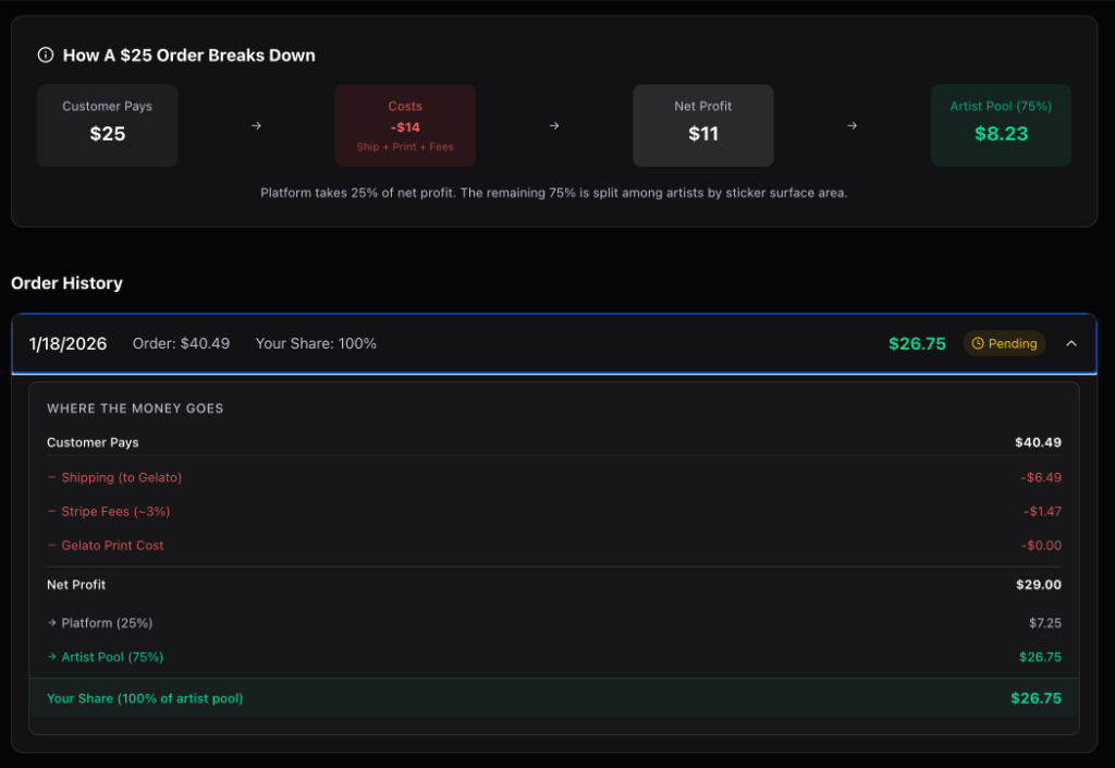Every order breaks down in real-time. You see exactly where every dollar goes — manufacturing, shipping, fees, platform, and your cut.